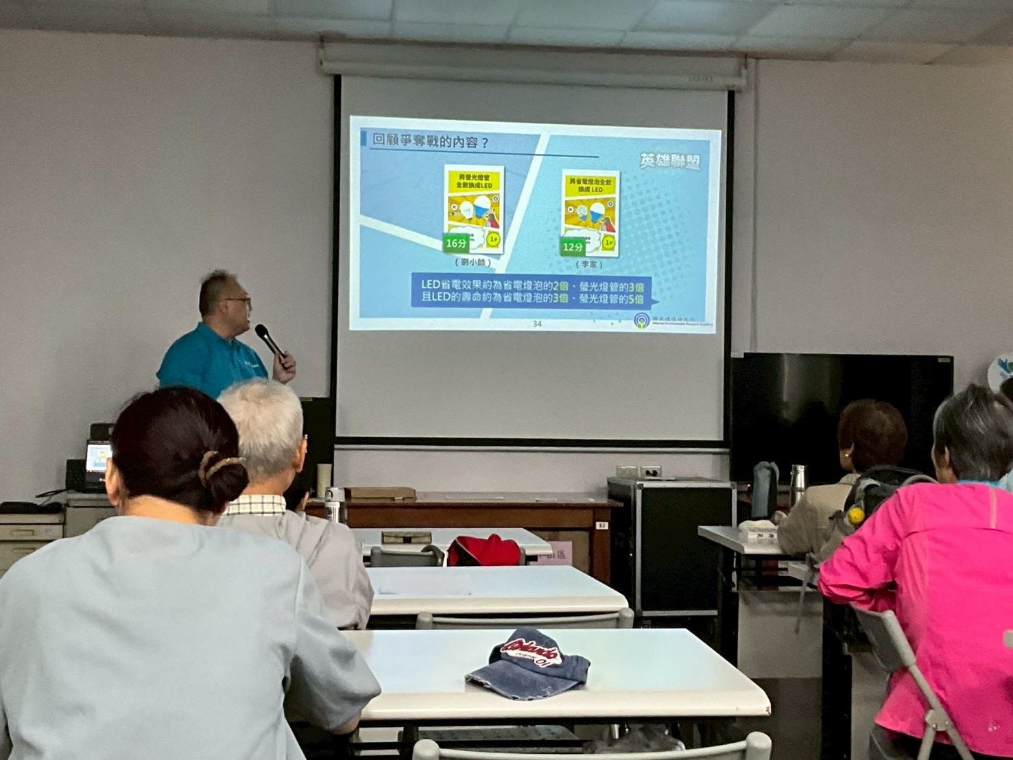 在課程中,志工將扮演綠生活規劃師為課程中虛擬的委託人(劉小帥和李阿嬤)規劃減碳生活計畫,並透過卡牌遊戲計算總分,這些分數代表了其所能達到的二氧化碳當量和省電量。分析結果顯示,在多項行動中,更換LED燈泡被認為是最划算的選項。其他有效的減碳策略包括汰換老舊電器(如老舊冰箱),因其耗電量較高,以及調整冷氣使用習慣(如設定定時)都能獲得遊戲中的有效分數。